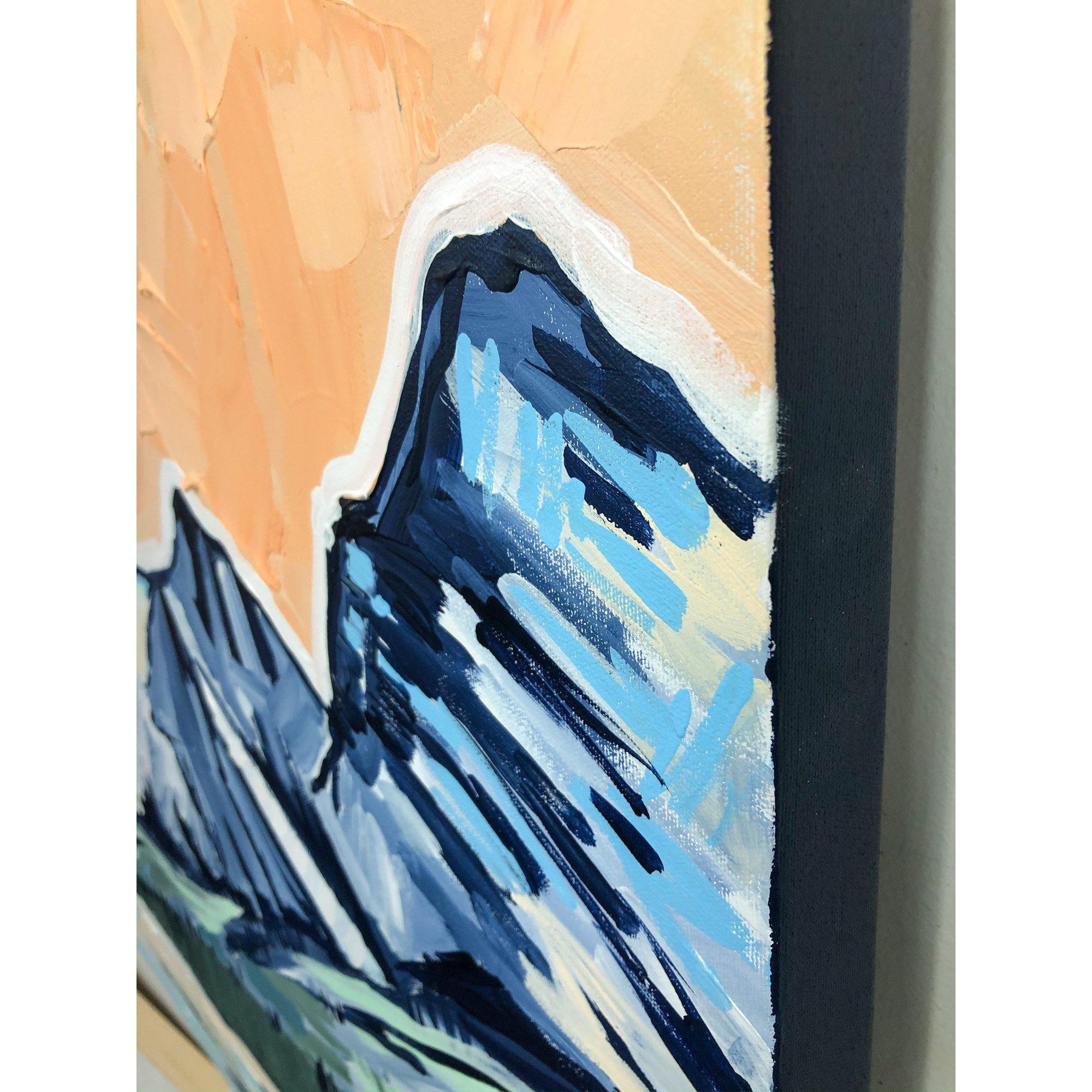This original painting is painted on 1 1/2" deep gallery wrapped canvas. The sides are painted deep blue. This bold, colourful painting is inspired by the stunning views from Mount Engadine in Kananaskis Country, Alberta. The sky is full of juicy texture.