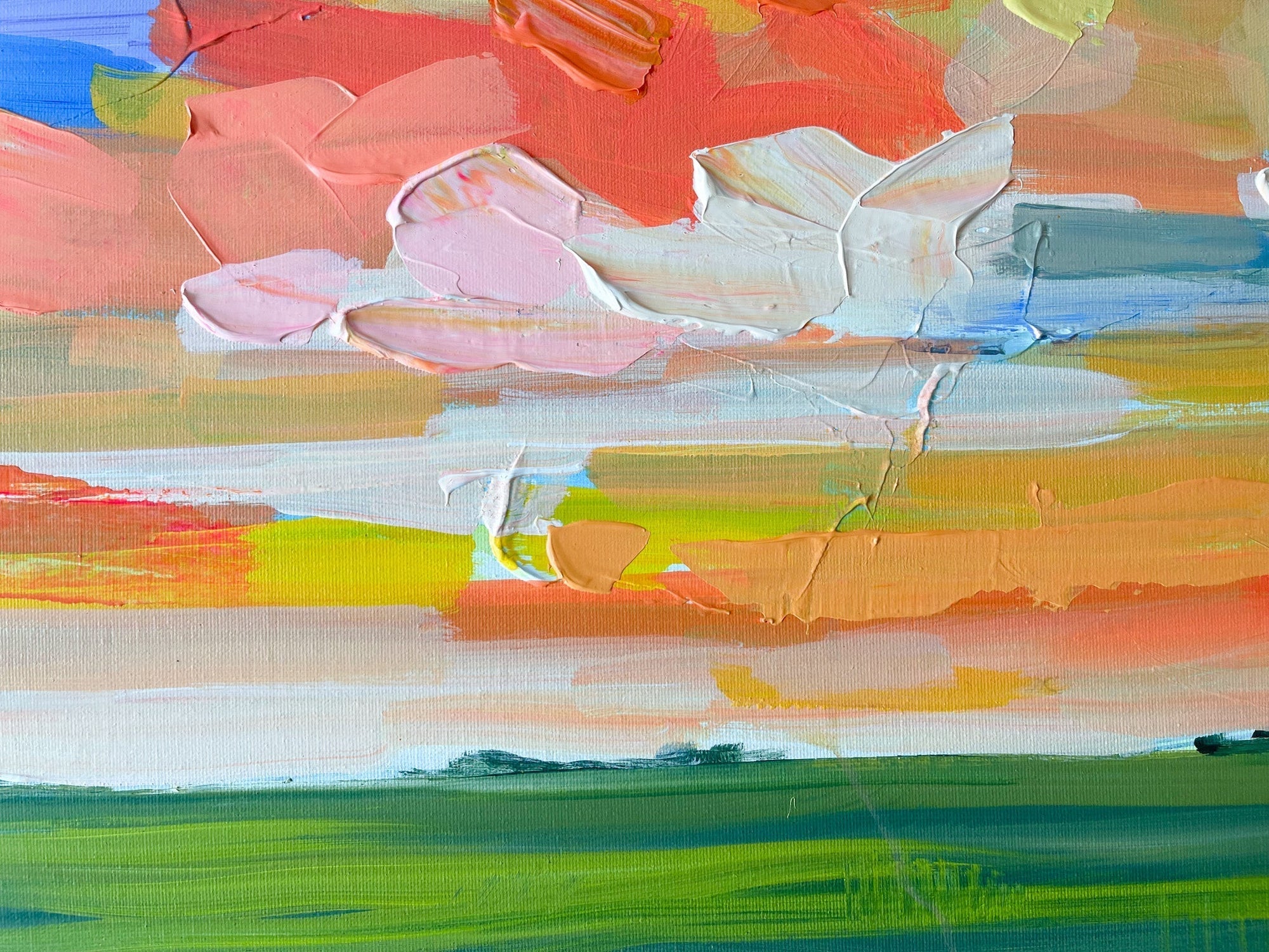I love yellow fields and vast blue sky, but light and weather do incredible things to the places we think we know. Yellows can turn green and pull peach from the sky as the sun sets. Blues can be speckled with shades of violet and neon pink, creating a kaleidoscope of colour. It was incredible to discover that no matter what I put on the canvas, nature did it first.