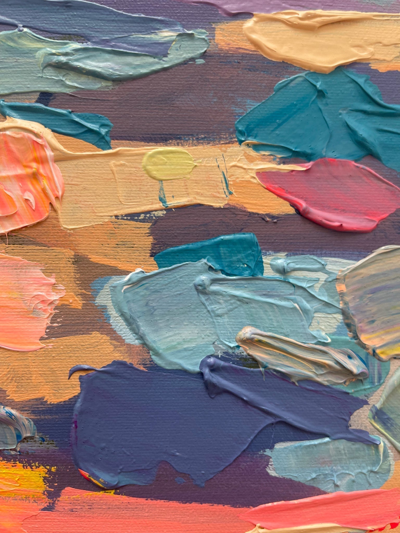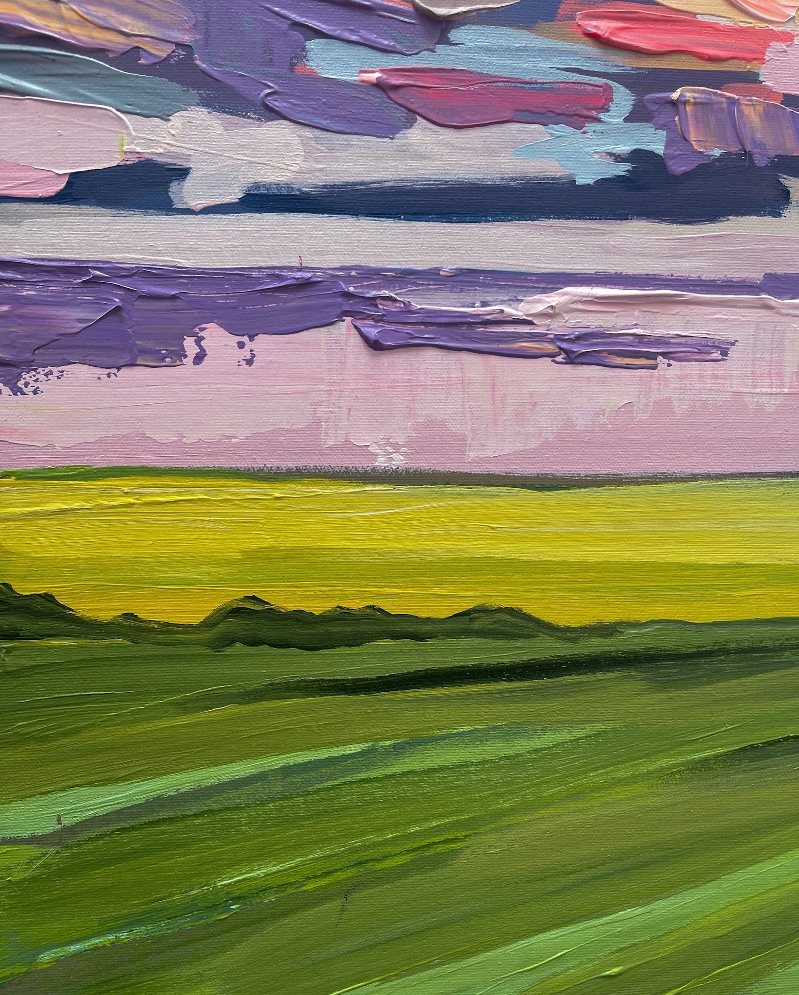 I love yellow fields and vast blue sky, but light and weather do incredible things to the places we think we know. Yellows can turn green and pull peach from the sky as the sun sets. Blues can be speckled with shades of violet and neon pink, creating a kaleidoscope of colour. It was incredible to discover that no matter what I put on the canvas, nature did it first.