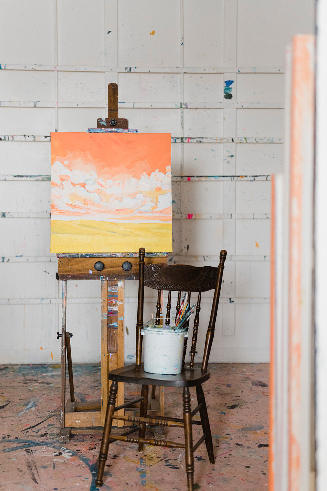 I love yellow fields and vast blue sky, but light and weather do incredible things to the places we think we know. Yellows can turn green and pull peach from the sky as the sun sets. Blues can be speckled with shades of violet and neon pink, creating a kaleidoscope of colour. It was incredible to discover that no matter what I put on the canvas, nature did it first.
