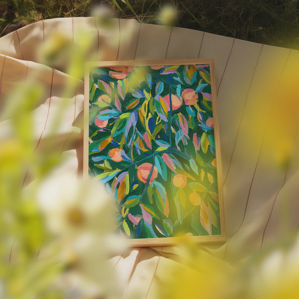 Prints are sold unstretched and unframed unless you select the framed option. If you choose to add a natural wood frame to your print, please note it will add approximately 1.5 inches to each side of the painting.